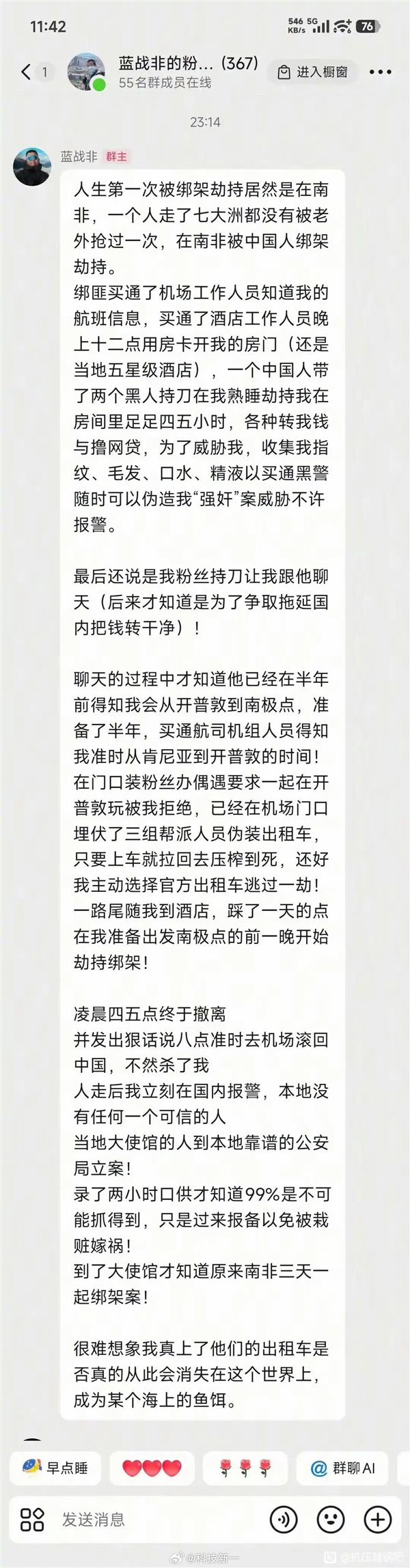 此前报道显示,网上流传出蓝战非在其会员群内说“自己在南非遭遇绑架遭遇”的群聊截图。蓝战非称,人生第一次被绑架劫持居然是在南非,一个人走了七大洲都没有被老外抢过一次,在南非却被绑架劫持。